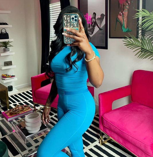 Style: Two-piece set featuring a crop top and skinny leggings.