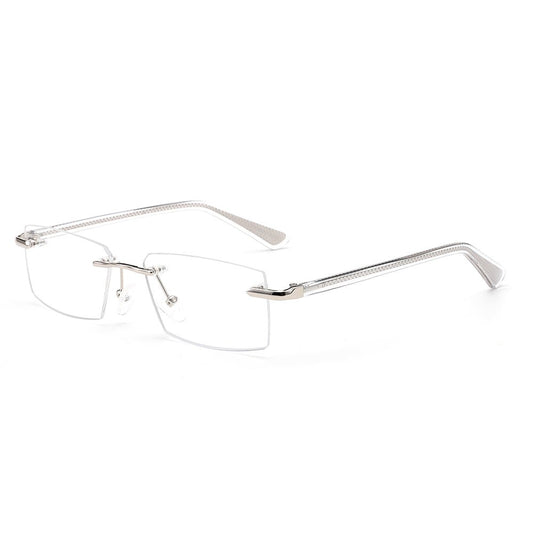 These stylish glasses showcase a sleek silver frame with MCROONS sharp, defined edges, offering a modern and sophisticated look. The dark gray temples provide a comfortable fit and contrast nicely with the transparent lenses, making them suitable for both casual and formal occasions. Ideal for both men and women, these glasses are perfect for anyone looking to make a fashion statement while enjoying clarity in vision.