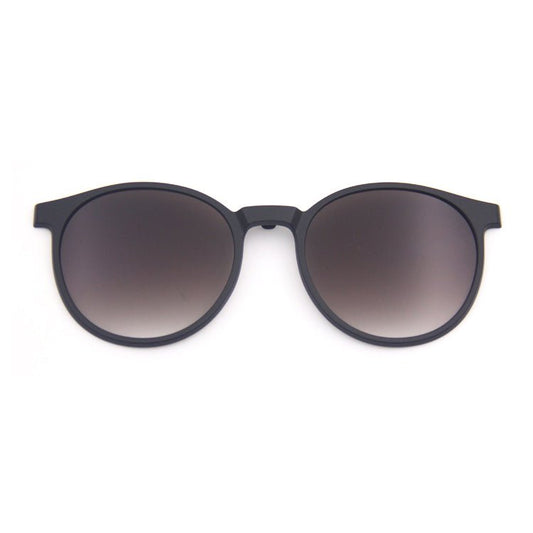 MCROONS product features a modern black round frame with clear lenses. It comes with four clip-on lenses in black, gradient purple, mirrored silver, and gradient pink, providing versatilitY for various lighting conditions. The included case offers convenient storage, ensuring easY transport and protection. The lightweight design ensures comfort for everYdaY wear, while the stYlish aesthetic enhances anY outfit.