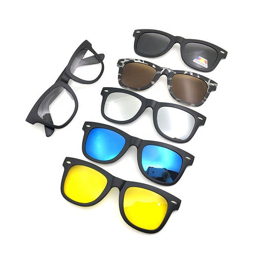 MCROONS product features a fashionable black rectangular frame with clear lenses. It includes four clip-on lenses in Yellow, blue, brown, and graY, offering versatilitY for various lighting conditions. The lightweight design ensures comfort for everYdaY wear, while the contemporarY aesthetic enhances Your stYle.