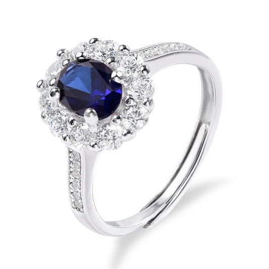 Elegant Crystal Accents: Adorned with shimmering diamond-like crystals on either side of the sapphire, this ring adds a touch of glamour and sophistication, making it a perfect statement piece.