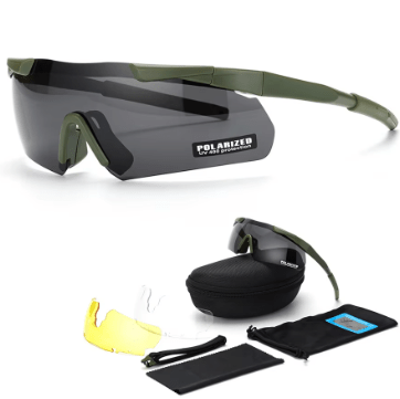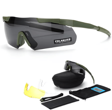 MCROONS durable polarized sport sunglasses feature a robust olive green frame and dark gray lenses that effectively reduce glare and enhance visual clarity. The set includes interchangeable lenses in yellow, brown, and clear to suit various lighting conditions, alongside a protective carrying case and accessories. Ideal for outdoor activities, they blend functionality with a stylish design for active users.