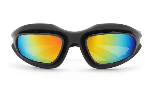 MCROONS versatile sport sunglasses feature a durable black frame and interchangeable lenses with a striking mirrored yellow and blue finish. Designed for optimal performance, the set includes multiple lens options for different lighting conditions, along with a protective carrying case. Perfect for outdoor activities, they combine functionality with a sleek design, ensuring both eye protection and style.