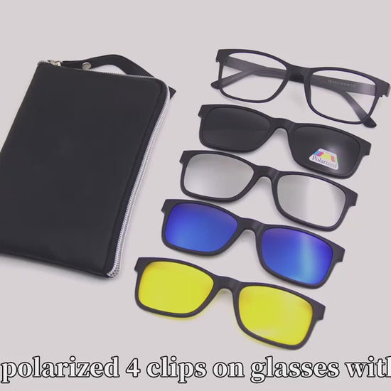 MCROONS product features a modern black rectangular frame with clear lenses. It includes four clip-on lenses in Yellow, blue, mirrored silver, and dark graY, providing versatilitY for different lighting conditions and personal stYles. The lightweight design ensures comfort, making it ideal for everYdaY wear and various occasions. The sleek aesthetic adds a fashionable touch to anY outfit.